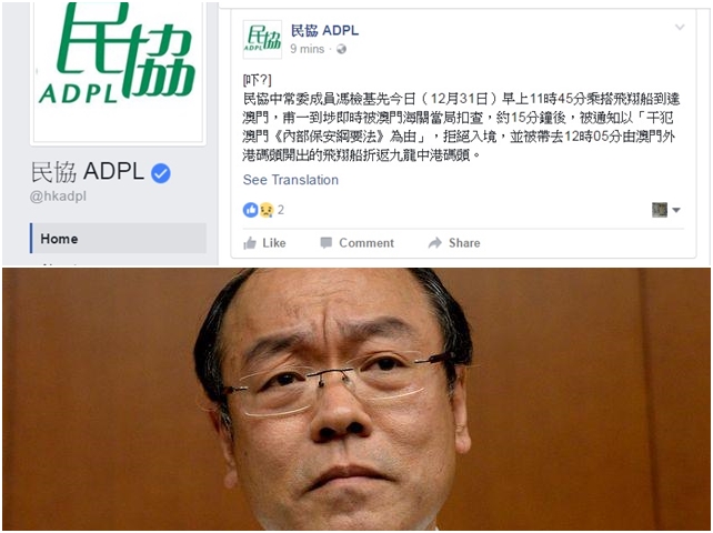發表文章發起投票澳門拒馮檢基入境 扣查後遣返港民協立法會前議員馮檢基今日被澳門拒絕入境,並被遣返香港。民協在facebook貼文指,「民協中常委成員馮檢基先今日(12月31日)早上11時45分乘搭飛翔船到達澳門,甫一到埗即時被澳門海關當局扣查,約15分鐘後,被通知以『干犯澳門《內部保安綱要法》為由』,拒絕入境,並被帶去12時05分由澳門外港碼頭開出的飛翔船折返九龍中港碼頭。」http://std.stheadline.com/instant/articles/detail/306887-香港-澳門拒馮檢基入境+扣查後遣返港 002016/12/31, 1:23:28 下午本貼文共有 0 個回覆此貼文已鎖,將不接受回覆發表文章發起投票