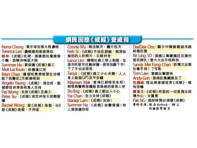 今天驚聞《成報》管理層的人身安全受嚴重威脅,心情沉重。一場特首選舉,場面猙獰,窮途末路,終極反撲,已達至你死我活的局面,幹出了無法無天的事,竟然膽敢把香港人的回鄉證照片交給不法分子,用作印製恐嚇海報四處張貼,以配合團團夥夥、結黨營私的「地下活動」,完全把國家主席習近平倡導的「依法治國」變成空話,沒有一絲一毫的法律,嚴重違紀違法,嚴重破壞「一國兩制」,中央核心應當徹查。我感謝《成報》堅持保護消息來源,不為利益或威嚇而動搖。各位讀者放心,我沒打算把手上的一支筆擱下。