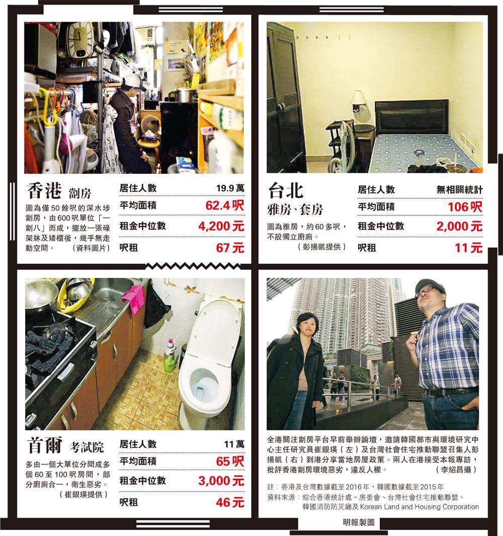 住屋問題不獨困擾港人,在台灣及韓國亦引發社會問題。三地市區寸金尺土,各類劏房應運而生,然而本港的劏房平均面積只有62.4呎,為三地中最細,但每呎租金亦是最高,較首爾的劏房貴46%,更是台北的6倍。「聯合國早已確認住屋是基本人權,理應得到保障」,台韓學者慨嘆本港劏房居住環境惡劣,違反人權。