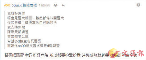 該名自稱警察的網民又稱,自己執勤時若遇到「抗爭者」,會「扮頭暈」或「揸流攤」避免執法,並聲言︰「扑/噴得多人無獎,無得加人工架(㗎)。」有關言論已連載了6個帖文,至昨日仍有更新。