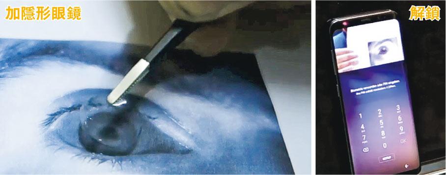 黑客組織CCC展示破解Galaxy S8虹膜解鎖功能,只要列印手機主人的眼睛部分,再在打印的虹膜上放一枚隱形眼鏡(左圖),就能騙過S8解鎖(右圖)。(網上圖片)