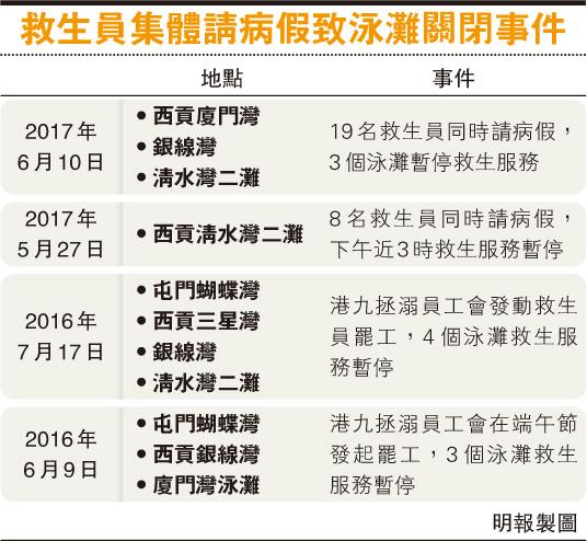 有救生員工會表示,前線不滿薪酬待遇及人手不足,至昨日多人請病假;議員倡康文署與工會商討正視問題。[#f00e1d]昨與一家大小到受影響泳灘的許先生批評,3個泳灘19名救生員一同請病假的行為,是罔顧公眾安全,即使是爭取福利,也應繼續維持泳灘救生員服務[/#f00e1d]。