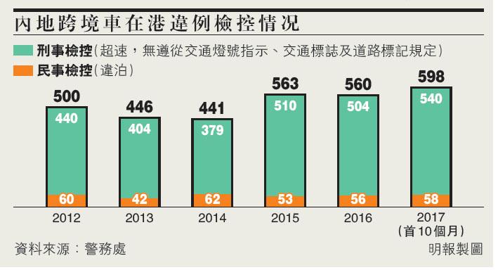另外,涉及內地跨境車在港違例檢控亦創6年新高,由2012年的500宗增至今年首10個月的598宗,涉及違泊、超速及無遵守交通燈號等。