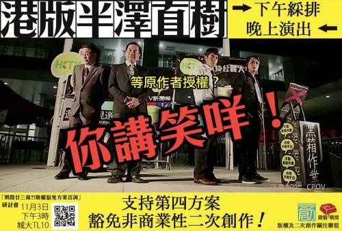 是次版權(修訂)條例諮詢,政府只針討論「戲仿」作品豁免條件的方式。據政府諮詢文件,「戲仿」一詞將囊括四類較常見的類型:戲仿 (parody)、諷刺(satire)、滑稽(caricature)和模仿作品。政府並提出三個方案:澄清法律條文、為戲仿作品提供刑事豁免、為戲仿作品訂定公平處理的民事及刑事豁免。而然,網民認為,政府現時的戲仿適用範圍太窄,仍未能涵蓋網絡常見的二次創作,如網上截圖(Cap圖),網民只選取影片精警對白回應社會現況,當中並沒有任何改動;有時舊曲新詞或為喜愛歌曲自製影片亦不一定有「戲仿」的意味。民間版權及二次創作關注聯盟提出以加拿大版權法為參考的「第四方案」:非牟利的個人衍生創作(User generated content,UGC)即可獲得豁免民事及刑事責任。