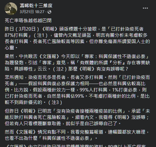 但昨日《明報》已明言「沒有染疫者接種兩種疫苗的比例」,承認「未能反映打科興者死亡風險較高」。
