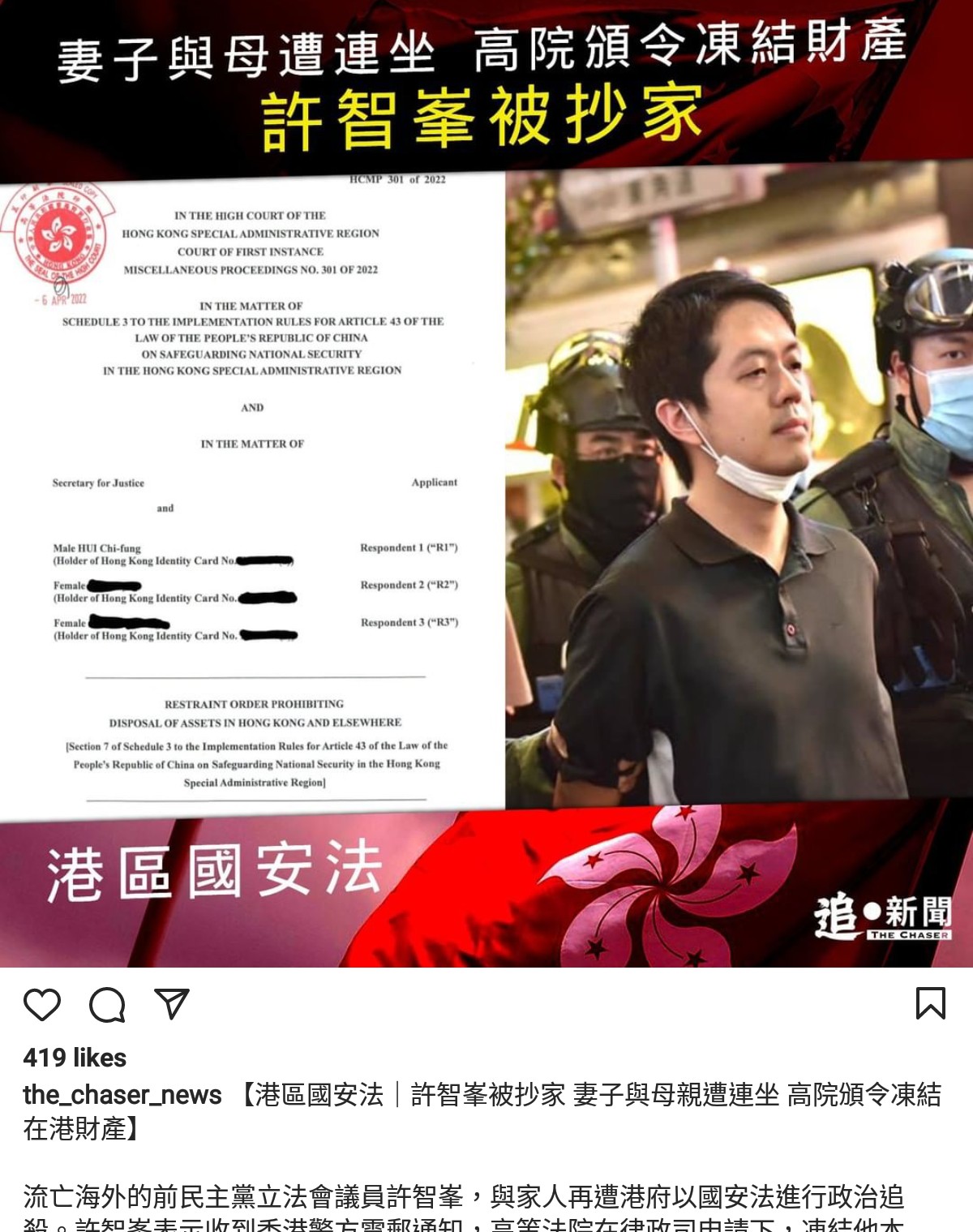 流亡海外的前民主黨立法會議員許智峯,與家人再遭港府以國安法進行政治追殺。 許智峯表示收到香港警方電郵通知,高等法院在律政司申請下,凍結他本人、妻子及母親在港的所有財產,若違反命令可被判藐視法庭及充公全部財產。 許智峯批評港共政權手法卑劣,事件是侵犯人權的有力例證,呼籲國際社會抵制及懲罰不義政權。
