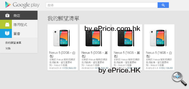 ePrice.HK 實習生 YK 試過怎樣把這些資訊 Chok 出來,方法就是叫美國朋友,在美國本土,用 YK 的 Google 戶口登入,再進入香港 Play Store,就會找到 Nexus 5 資料。不過呢,暫時只能把有關資訊放入我的願望名單,未買到機,亦未能進入產品資訊頁。一直說 20/11 香港 Google Play Store 會賣 Nexus 5,似乎這個說法是真的。若果你想入手 Nexus 5,版主建議你等多幾日吧。